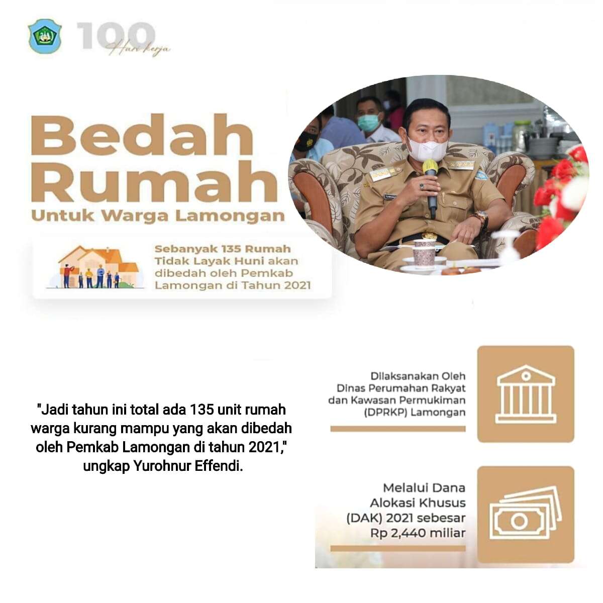 “Jadi tahun ini total ada 135 unit rumah warga kurang mampu yang akan dibedah oleh Pemkab Lamongan di tahun 2021 ini,” katanya.