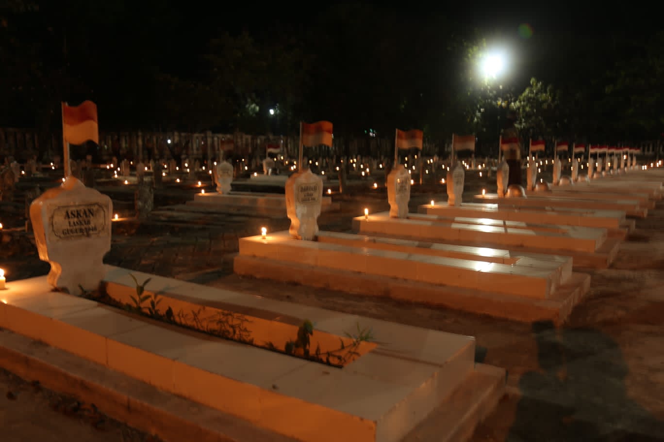 Suasana gelap dan sunyi pun seketika menjadi terang dengan adanya lilin yang menghiasi ratusan makam para pahlawan maupun pejuang di TMP Kusuma Negara kabupaten Lamongan