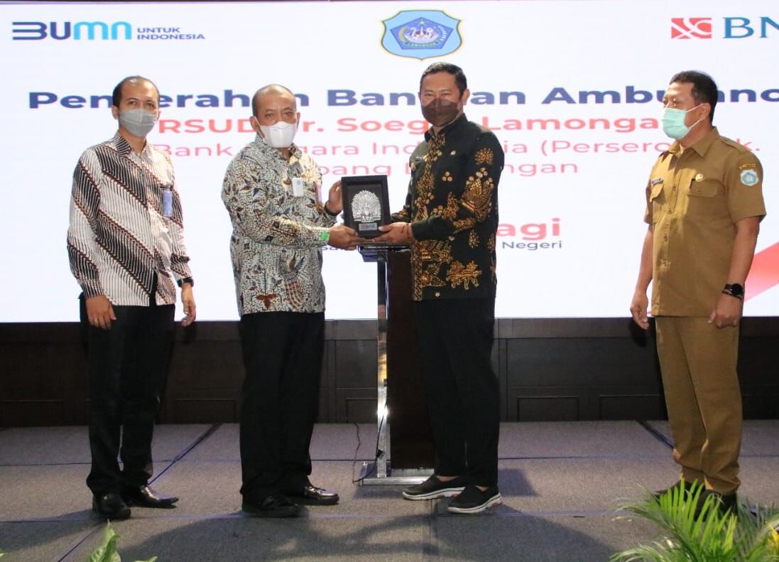 Pada Program BNI Berbagi tersebut diserahkan 1 unit mobil ambulans secara simbolis. Mobil ambulance ini diserahkan oleh pimpinan BNI kantor Wilayah 06 Muhammad Gunawan Putra kepada Direktur RSUD Soegiri Muhammad Chaidir Annas. (**)