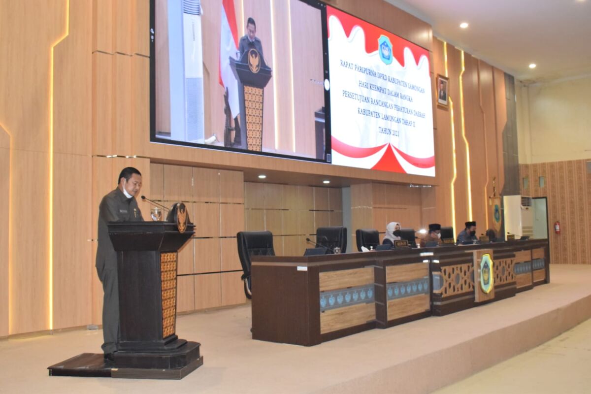 Kabar1lamongan.com – Dengan disetujuinya lima Rancangan Peraturan Daerah (Raperda) inisiatif eksekutif dan legislatif Lamongan pada Sidang Paripurna dalam agenda Persetujuan Raperda Kabupaten Lamongan Tahap II Tahun 2021, Senin (13/12) Bupati Lamongan Yuhronur Efendi mengapresiasi peran aktif seluruh elemen masyarakat, tak terkecuali eksekutif dan legistalif Lamongan mulai proses pembahasan hingga persetujuan yang dinilai sangat besar. Sehingga dalam aplikasinya seluruh Perda tersebut dapat dilaksanakan secara optimal.