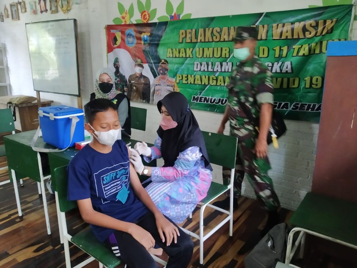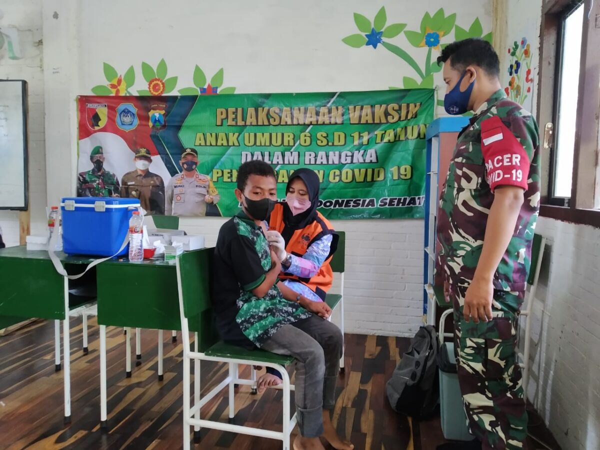 Kabar1Lamongan.com – Babinsa Koramil 0812/03 Turi jajaran Kodim 0812/Lamongan Kopda Dedy melaksanakan pengamanan dan pemantauan dalam kegiatan vaksinasi COVID-19 bagi anak usia Dini 6-11Tahun untuk mengejar target, yang di laksanakan di Ponpes SPMAA Desa Turi, Kecamatan Turi, Kabupaten Lamongan, Kamis (30/12/2021).