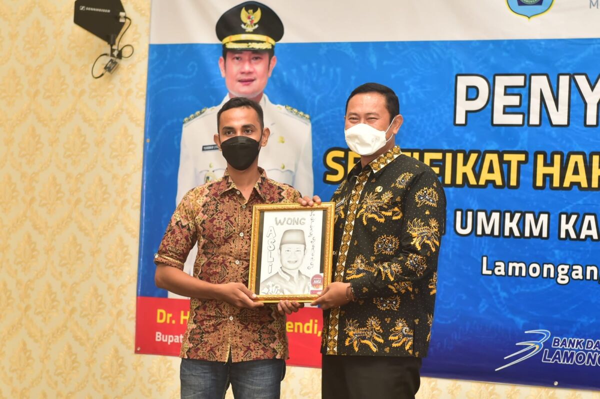 Bupati kebanggan Lamongan, Yuhronur Efendi secara simbolis menyerahkan langsung SHAT kepada pelaku UMKM di Ruang Pertemuan Gajah Mada Lantai 7 Pemkab Lamongan, Jumat (31/12).