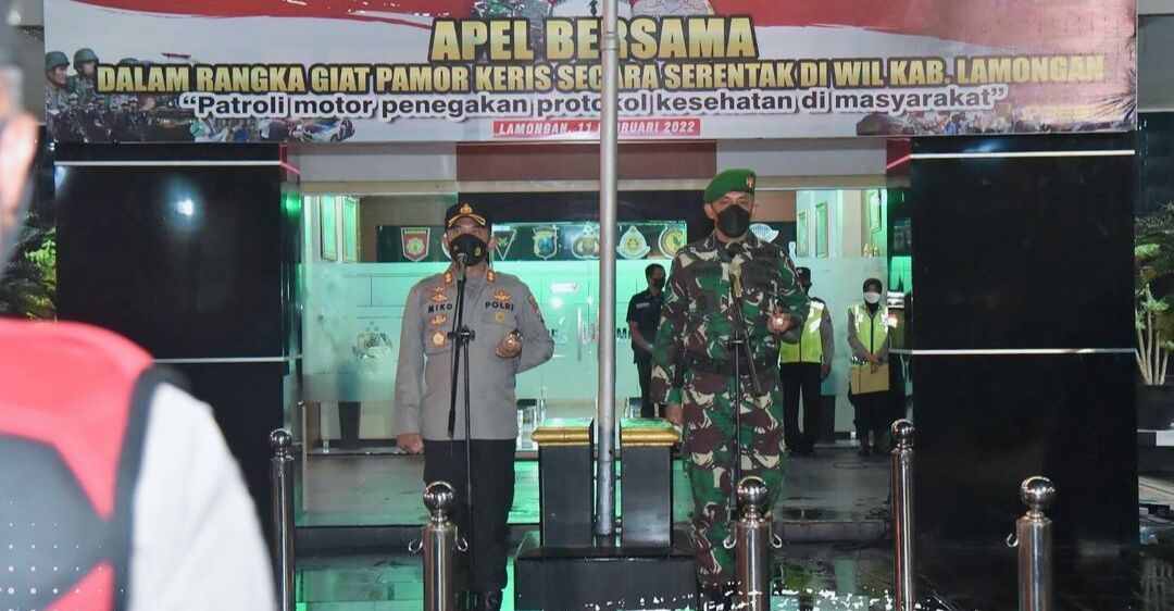 Kabar1lamongan.com – Sebagai upaya antisipasi penyebaran covid-19 varian terbaru omicron di Kabupaten Lamongan, Tim Satgas PAMOR KERIS (Patroli Motor Penegakan Protokol Kesehatan di Masyarakat) Polres Lamongan yang terdiri dari unsur TNI, Polri dan Satpol PP serta Instansi terkait menggelar Apel Bersama Pamor Keris secara serentak di wilayah Kabupaten Lamongan.