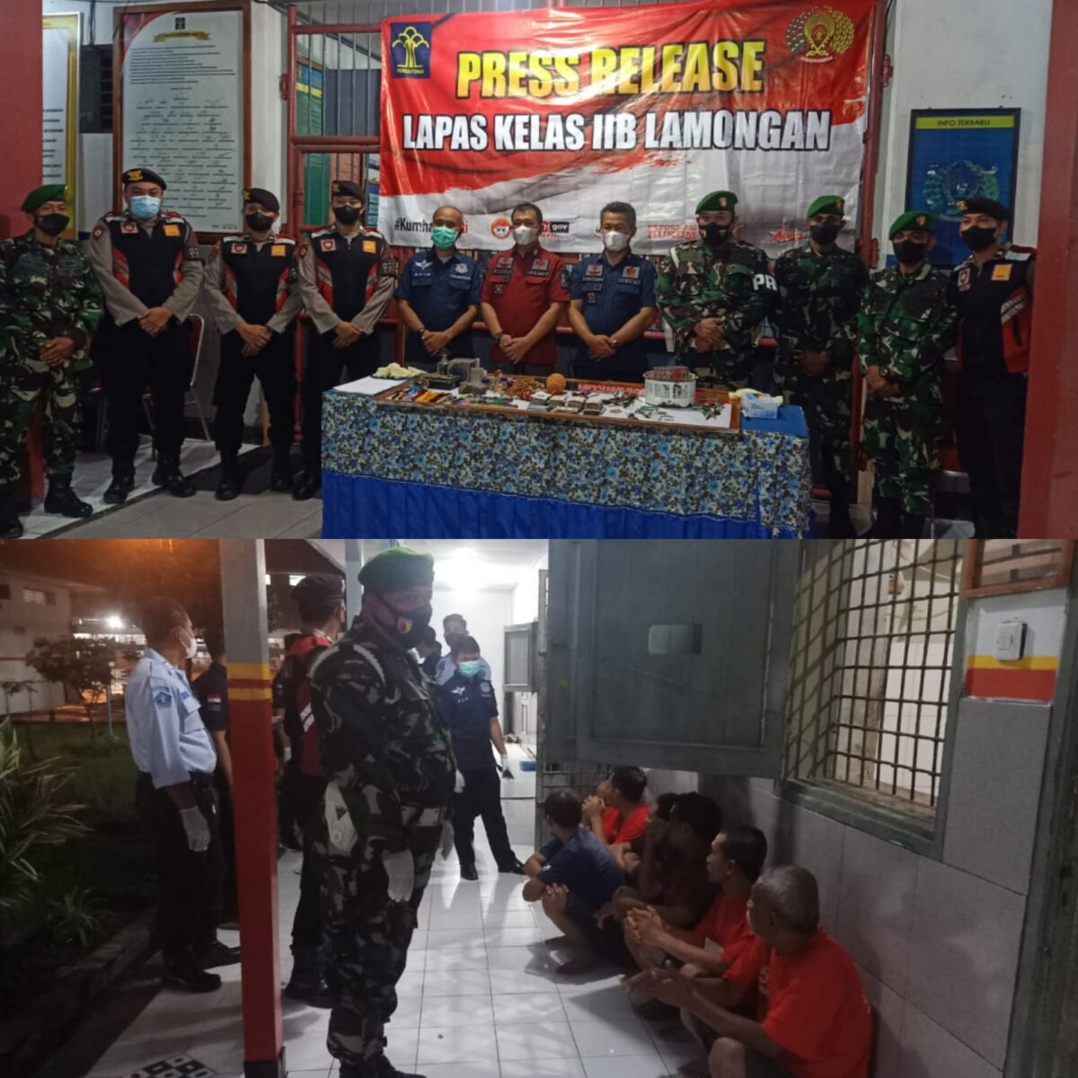 Kabar1lamongan.com – Aparat gabungan TNI Polri jajaran Kodim 0812 Lamongan dan Polres Lamongan bersama Lembaga Pemasyarakatan (Lapas) Kelas IIB Lamongan Kanwil Kemenkumham Jawa Timur melaksanakan razia kamar di setiap blok Warga Binaan Pemasyarakatan (WBP).
