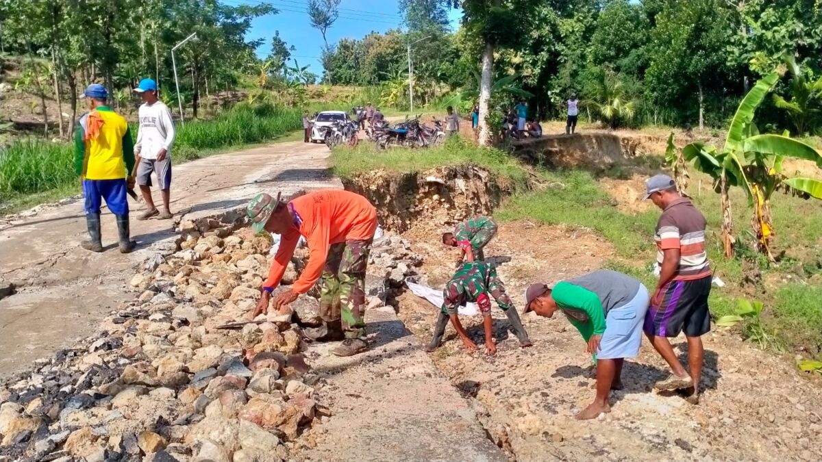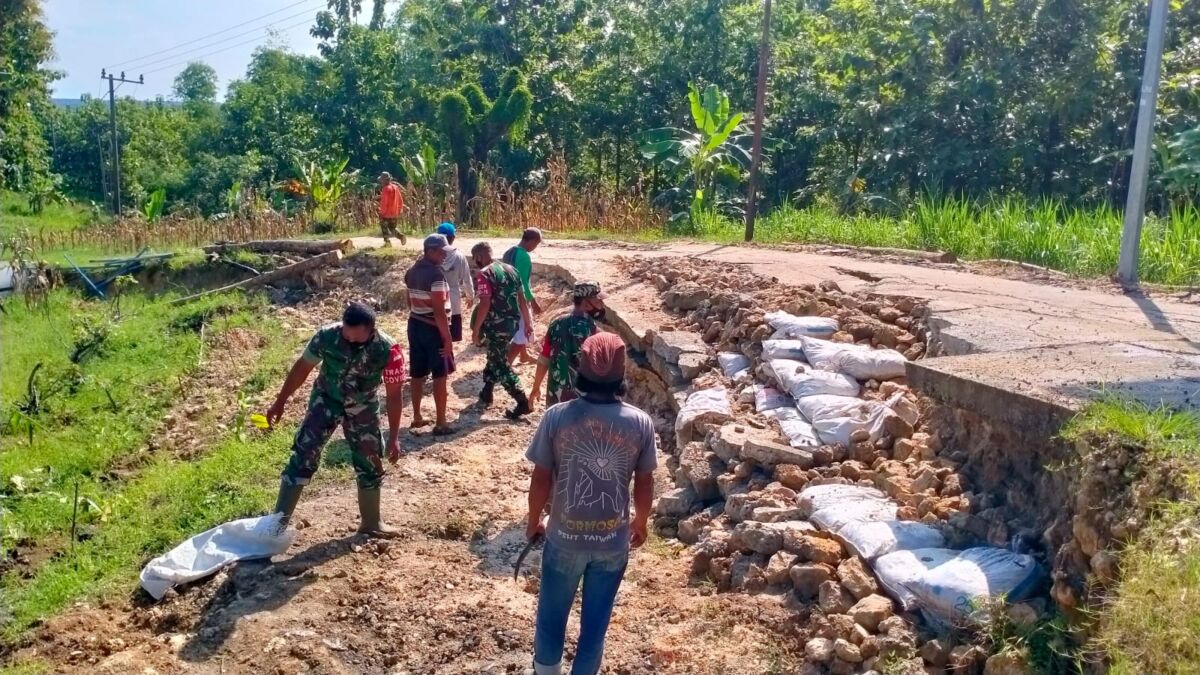 Seperti halnya, Babinsa Koramil 0812/09 Ngimbang, Serda suwardianto bersama Anggota Koramil Ngimbang dan masyarakat Desa Tlemang, memperbaiki jalan yang rusak karena longsor. Minggu (27/02/2022).