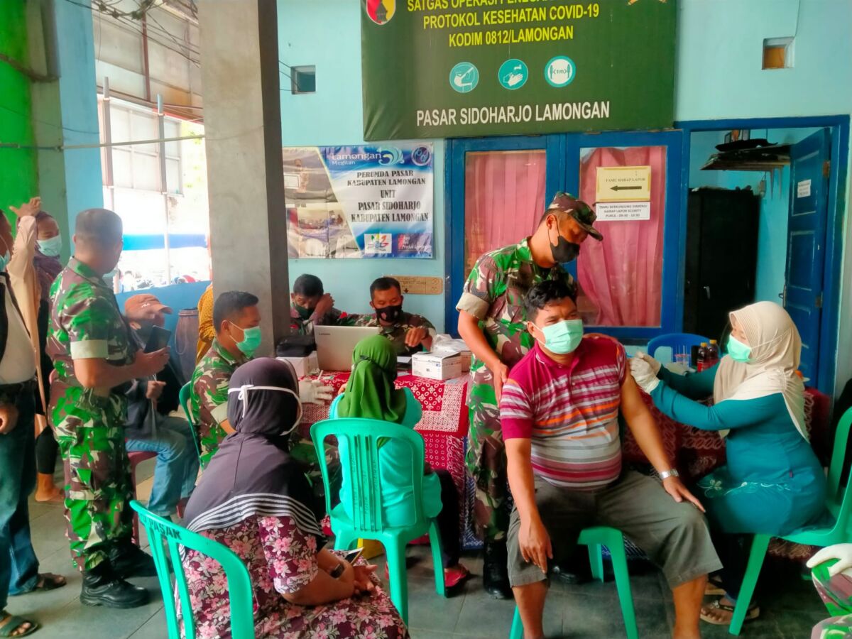 Kali ini yang jadi sasaran Tim Mobille Vaksinator jajaran Kodim 0812 Lamongan adalah Pasar Sidoarjo kecamatan Lamongan.
