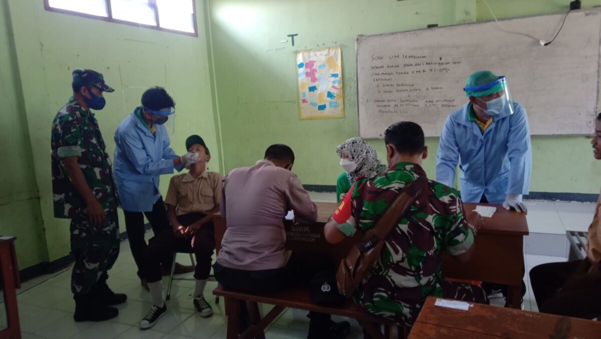 Kabar1Lamongan.com -Upaya Babinsa koramil 0812/26 Pucuk, Sertu Edy bersama Bhabinkamtibmas Polsek Pucuk dalam pendampingan pelaksanaan swab tes terhadap siswa SMA Negeri Pucuk dan SMK Pucuk, Kecamatan Pucuk, Kabupaten Lamongan, Rabu (09/03/2022).