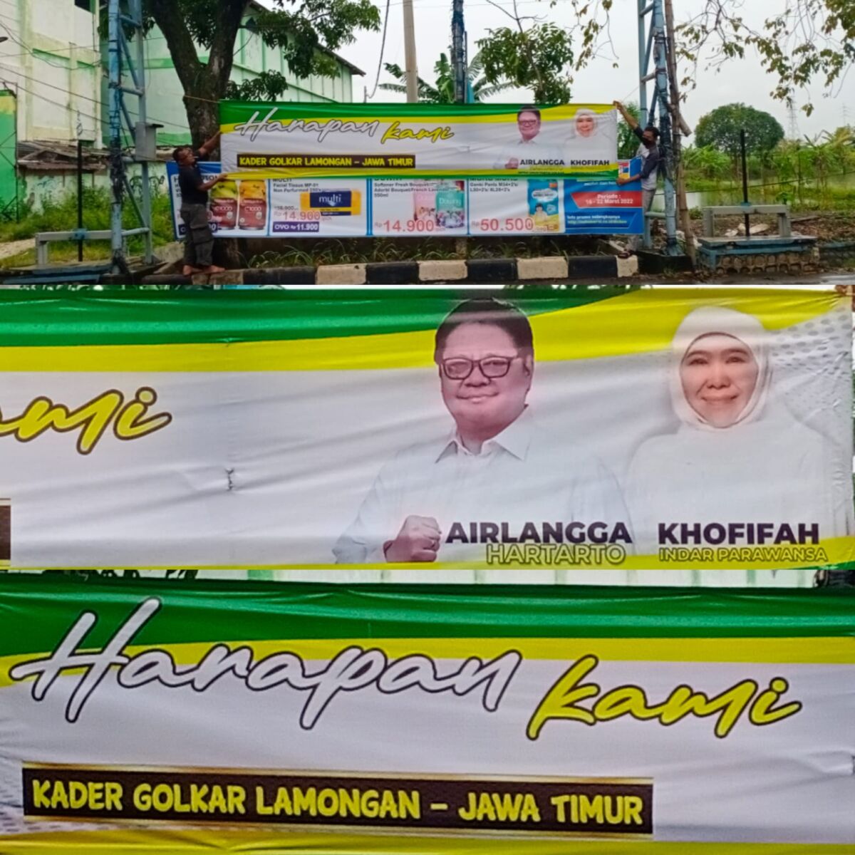 Kabar1lamongam.com – Bertebaran baliho serta banner dengan foto Airlangga Hartarto yang berpasangan dengan Gubernur Jatim Khofifah Indar Parawansa, Bertuliskan harapan kami banyak ditemukan di sejumlah ruas jalan di Lamongan.