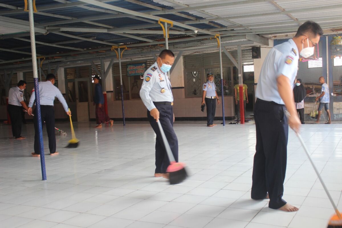 Daerah Sambut Bulan Ramadhan, Petugas Lapas Lamongan Gotong Royong Bersih-Bersih Masjid