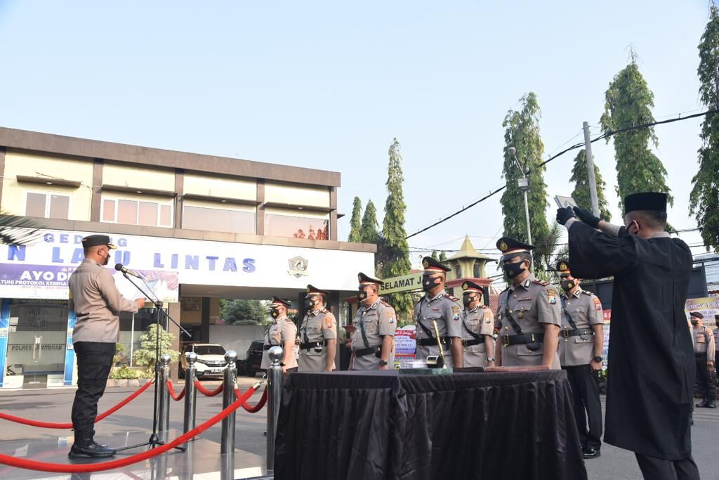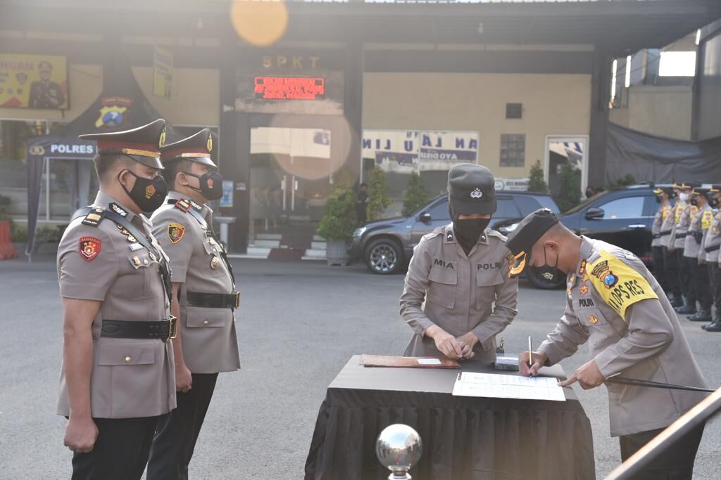 Kapolres AKBP Miko Indrayana menyampaikan selamat kepada anggota yang naik pangkat pengabdian maupun yang serah terima jabatan.
