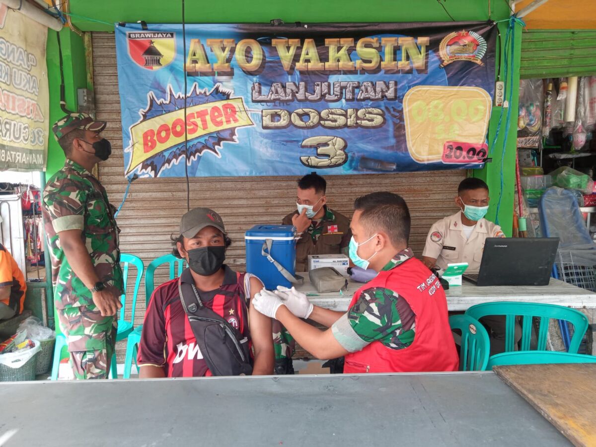 Pelaksanaan vaksinasi dosis 3 booster dengan menggunakan vaksin jenis Astrazeneca, selain untuk pengunjung dan pedagang pasar, juga ditujukan untuk warga sekitar pasar. Selasa (19/04/2022)