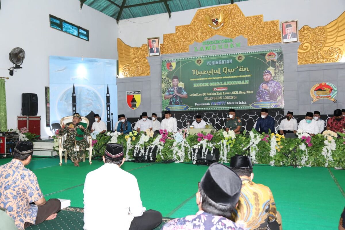 Dalam kegiatan Nuzulul Qur’an ini Komandan Kodim 0812/Lamongan Letkol Kav Endi Siswanto Yusuf saat di lokasi mengatakan peringatan Nuzulul Quran 1443 Hijriah ini mengusung tema “Impelementasikan Nilai Nilai Ramadhan dalam kehidupan prajurit TNI,”