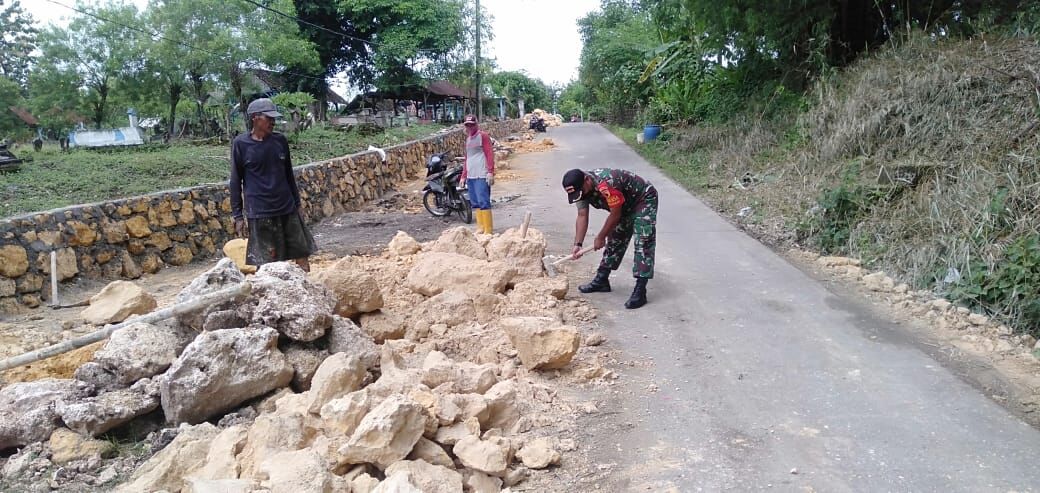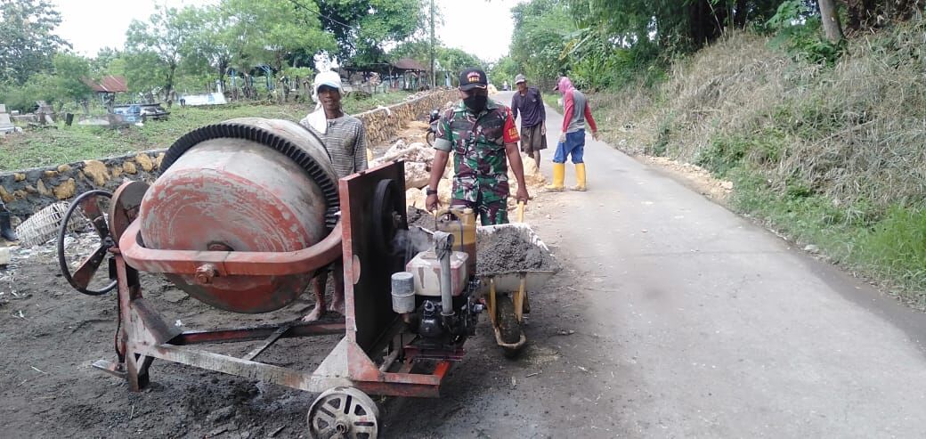 Seperti yang dilakukan di Desa kuwurejo Kecamatan Bluluk. Sedang dilaksanakan pembangunan plengsengan jalan yang dibantu oleh Babinsa Sertu Sukadi