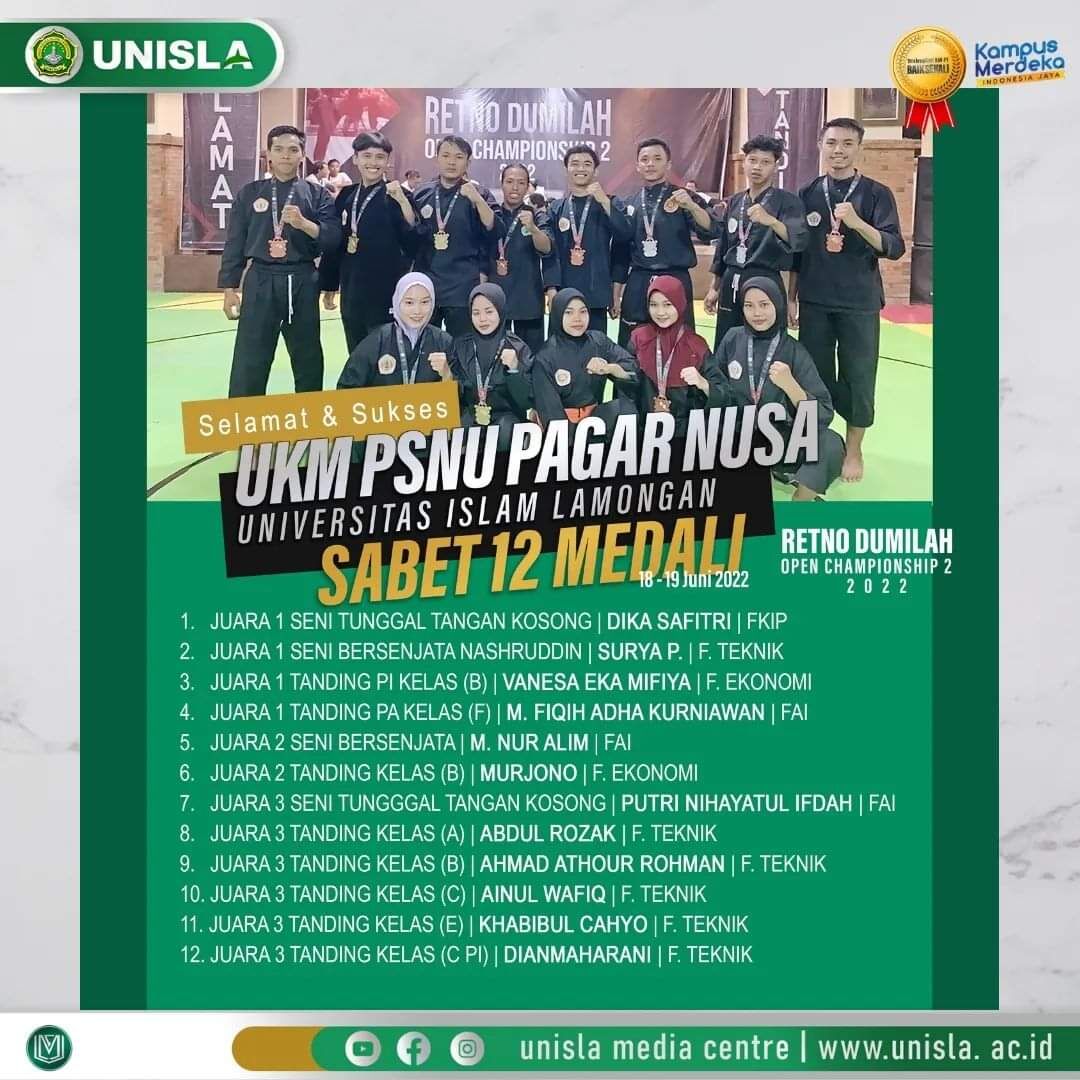 Kabar1lamongan.com – Unit Kegiatan Mahasiswa Pagar Nusa Universitas Islam Lamongan (UKM PN UNISLA) raih prestasi dalam Kejuaraan Nasional Retno Dumilah Open Championship 2. Dalam pertandingan yang diadakan secara offline pada 18-19/06/2022, bertempat di Gedung Sasana Krida Mulya Madiun.
