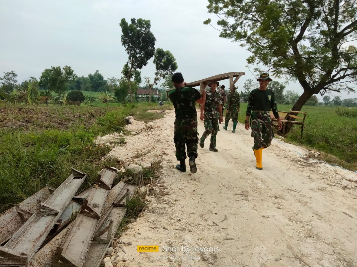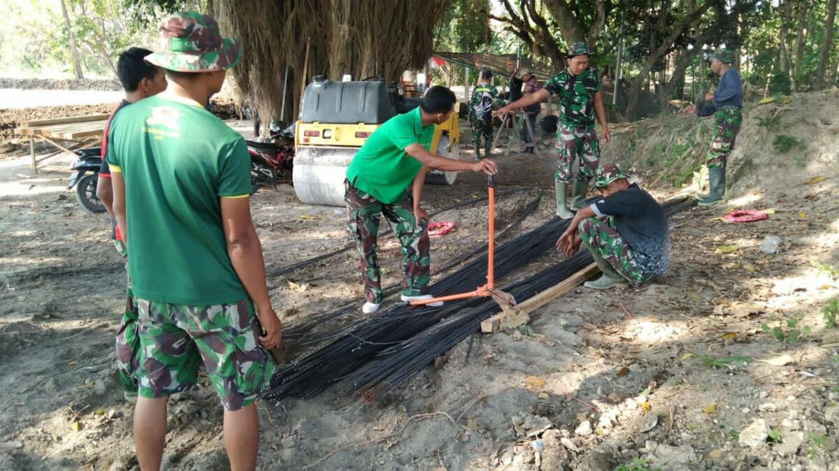 Kabar1Lamongan.com – Kegiatan Pra TNI Manunggal Membangun Desa (TMMD) ke- 114 Kodim 0812/Lamongan yang sedang berlangsung di Desa Tunggunjagir Kecamatan Mantup Kabupaten Lamongan ini, anggota Kodim 0812/Lamongan bersama Masyarakat Desa Tunggunjagir mengerjakan bagasting serta rangka pengeraman besi untuk kesiapan pengecoran jalan sepanjang 1.625 M Lebar 3.00M tinggi 0,20 M sudah berjalan. Jumat (15/07/2022)