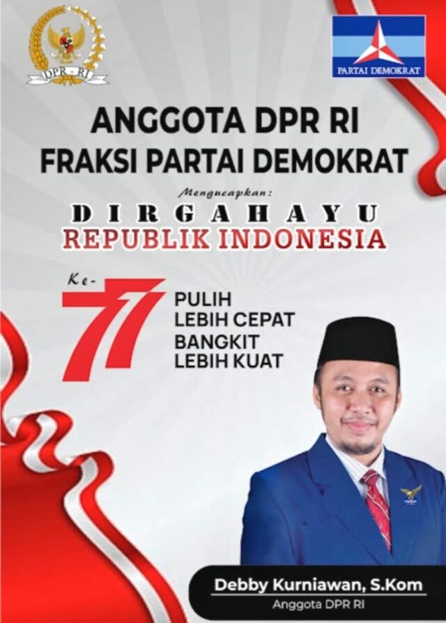 Debby Kurniawan, S.Kom Anggota DPR RI Fraksi Partai Demokrat Mengucapkan Selamat HUT RI ke-77.