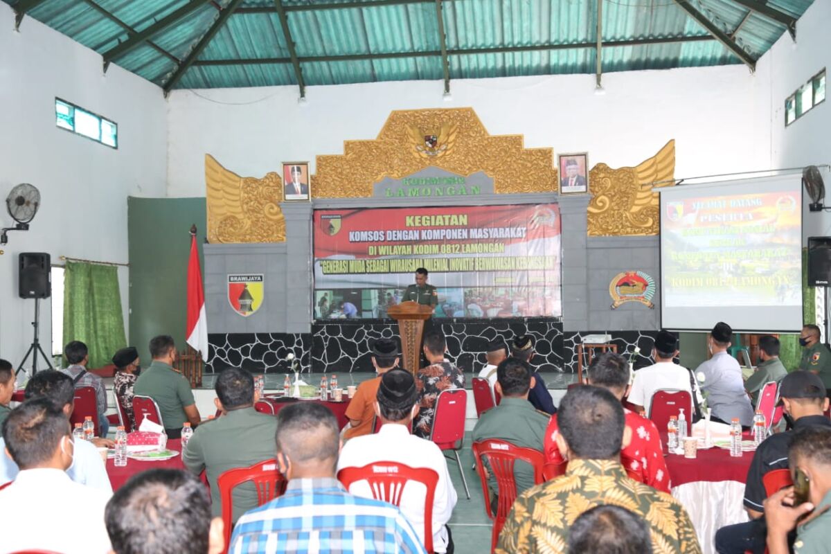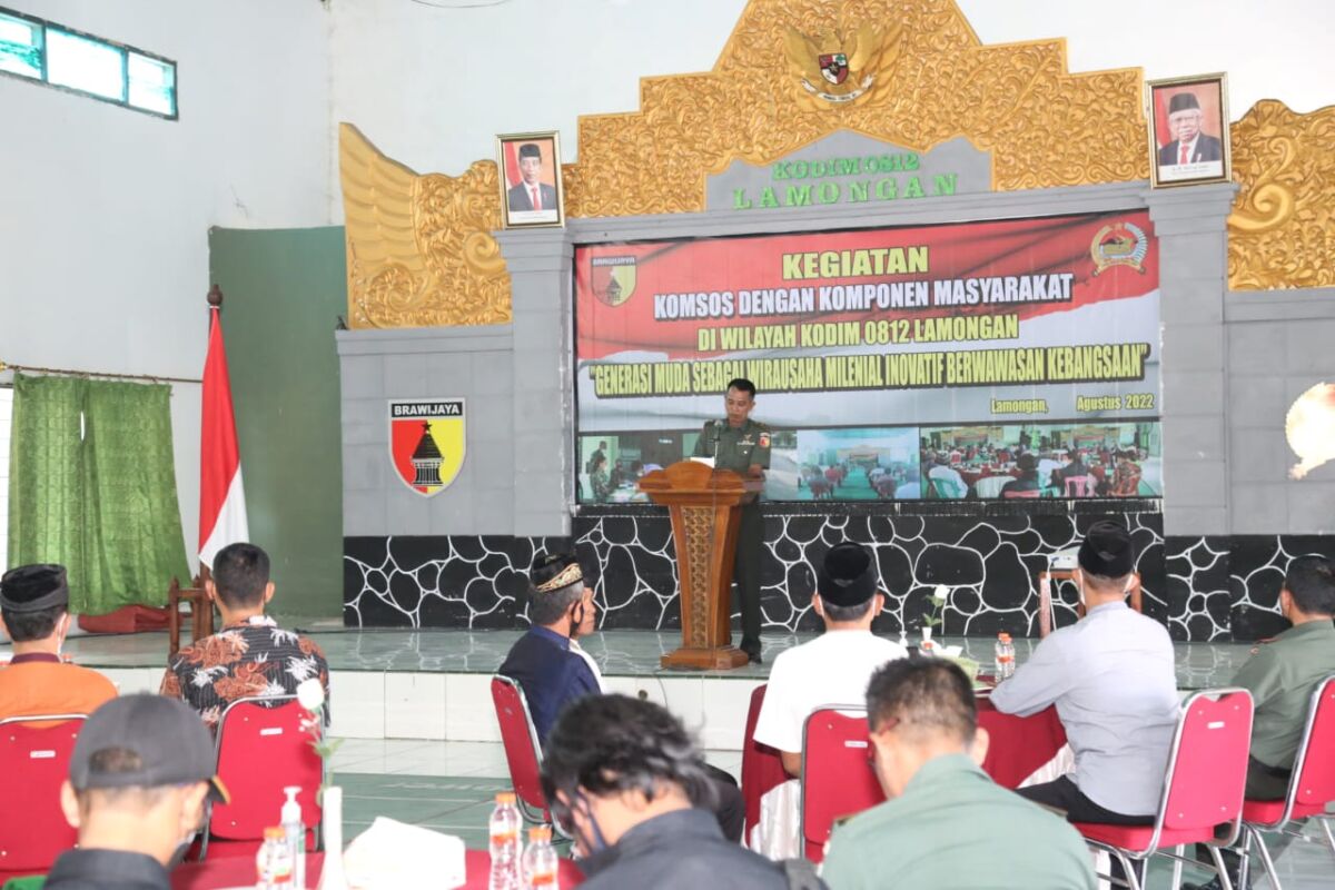 Kabar1Lamongan.com -Kodim 0812/Lamongan menggelar Komunikasi Sosial (Komsos) dengan Komponen Masyarakat, dalam rangka memelihara hubungan antara TNI dengan masyarakat, dengan tema “Generasi muda sebagai wirausaha milenial, inovatif berwawasan kebangsaan”, yang bertempat di Aula Kadetsuwoko Kodim 0812/ Lamongan. Kamis (11/8/2022).