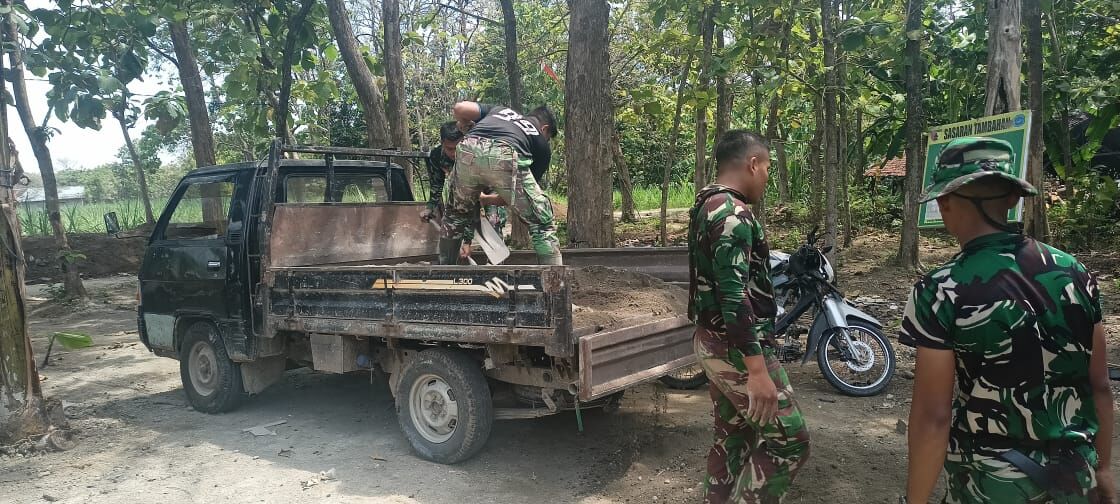 Disatu lokasi dimana tempat material pasir ditimbun untuk merehap Rumah Tidak Layak Huni (RTLH) yang disiapkan oleh Kapten Arm Yudi K selaku koordinator lapangan. Tanggung jawab sebagai koordinator lapangan salah satunya yaitu menyiapkan bahan material untuk pembangunan infrastruktur diwilayah desa ini.