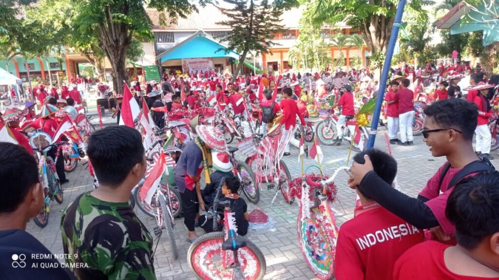 Kabar1lamongan.com – SMP Negeri 1 Kedungpring mengadakan kegiatan ngontel merdeka, sepeda hias dalam rangka memperingati HUT Kemerdekaan RI ke 77, yang diikuti oleh semua siswa-siswi SMPN 1 Kedungpring. Kegiatan ini berlangsung pada hari Selasa, tanggal 30 Agustus 2022.