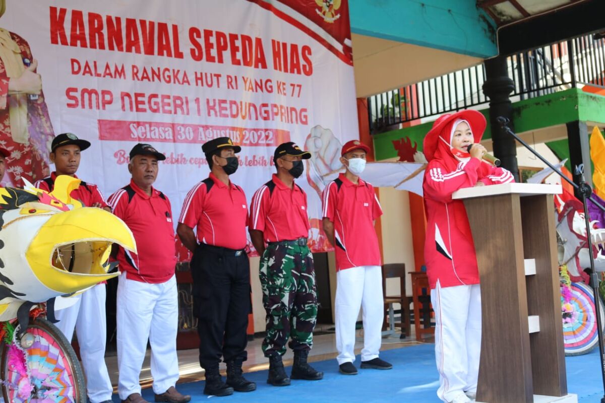 “Kegiatan ini dimulai dari pukul 07.00 wib, pertama dibuka dengan apel dan di lanjutkan dengan berkeliling menaiki sepedah rute sepedah hias ke timur menuju Desa Majenang lalu ke utara menuju Desa Blawirejo dan ke barat desa Sidobangun dan Tlanak, lalu ke arah selatan sampai ke timur Kecamatan Kedungpring dan finis sampai ke SMPN 1 Kedungpring. Kegiatan ini disambut sangat antusias oleh siswa siswi SMPN 1 Kedungpring,” Terang Kepala sekolah Ibu Sri Wahyuni, S.Pd, M.Pd.