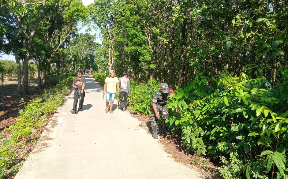 TNI Babinsa Ajak Masyarakat Kerja Bakti Bersihkan Jalan Dari Rumput Dan Ranting Agar...