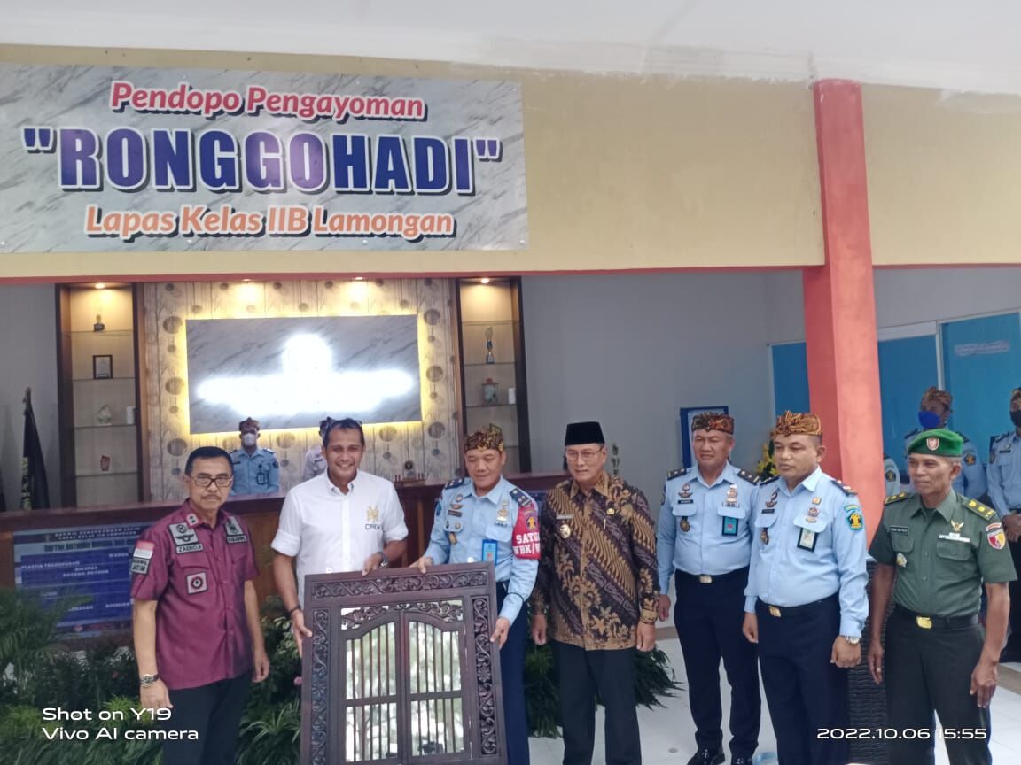 Sebelum melanjutkan perjalanan. Wakil Menteri Hukum dan HAM RI menerima cinderamata dari Lapas Kelas IIB Lamongan berupa cermin Ronggohadi, yang kemudian diabadikan dalam moment foto bersama seluruh Forkopimda, Pimti Wilayah, dan Seluruh Pegawai Lapas Lamongan.