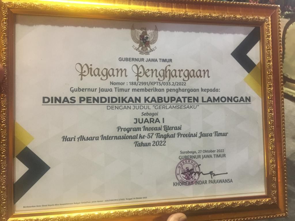 Dalam malam puncak acara penutupan HAI, Kabar gembira dan membanggakan Bahwasanya Dinas Pendidikan Lamongan Juarai lomba program inovasi Literasi tingkat provinsi Jawa timur yang dilaksanakan oleh Birokesra Setda Provinsi Jawa Timur dalam peringatan ke-57 Hari Aksara Internasional tahun 2022.