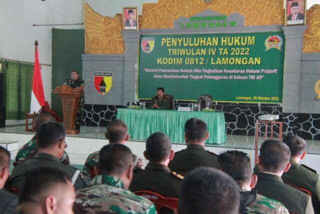 Kabar1Lamongan.com– Kodim 0812/Lamongan gelar kegiatan penyuluhan hukum Triwulan IV tahun 2022 bagi personil militer, PNS dan Persit, yang bertempat di Aula Kadet Soewoko Kodim 0812/Lamongan, Jumat (28/10/2022).