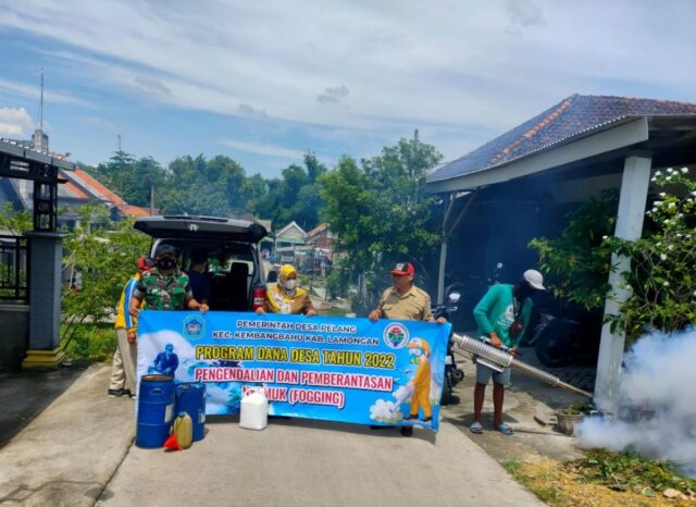 Kegiatan fogging dilaksanakan di rumah rumah warga serta selokan atau gorong gorong di Desa Pelang, Kecamatan Kembangbahu, Kabupaten Lamongan. Rabu (09/11/2022).