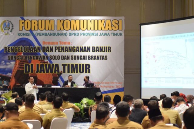 Kabar1lamongan.com – Menjadi narasumber dalam forum komunikasi yang diselenggarakan Komisi D (Pembangunan) DPRD Jatim pada Selasa (22/11) di Hotel Grand Mercure Surabaya, Bupati Lamongan Yuhronur Efendi menyampaikan paparan terkait integrasi penanganan banjir di sungai Bengawan Solo yang melewati Kabupaten Lamongan. Forum komunikasi ini mengambil tema tentang pengelolaan dan penanganan banjir Sungai Bengawan Solo dan Sungai Brantas di Jawa Timur.