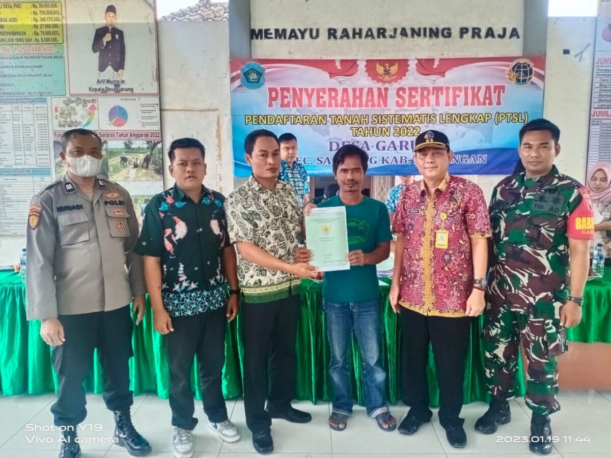 Turut hadir dalam pembagian PTSL Panitia BPN Bapak Prastyo dan 5 orang,Arif Mustain Kades Garung, Babinsa Desa Garung Koptu Okta Hendrik, Bhabinkamtibmas Aipda Nuryadi, Perangkat Desa Garung dan Warga Desa Penerima Sertifikat sebanyak 500 Orang. (Pendim0812)