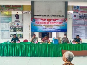 Babinsa Desa Garung bersama Bhabinkamtibmas Polsek Sambeng Aipda Nuriadi mendampingi penyerahan Sertifikat Program Nasional Pendaftaran Tanah Sistematis Lengkap (PTSL) oleh Tim BPN Bapak Prastyo sebanyak 500 orang Warga Masyarakat penerima sertifikat Di Balai Desa Garung.