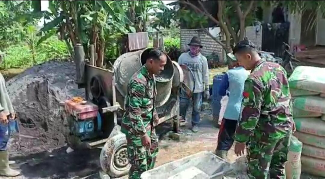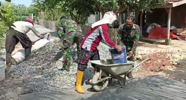 Babinsa Serda Trimo menyampaikan bahwa dirinya bersama warga melaksanakan kerja bakti untuk membangun jalan dengan cara mengecor badan jalan agar mempermudah akses dan mobilitas warga.