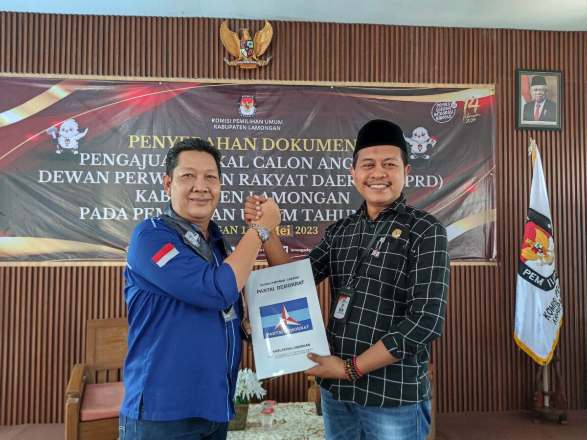 Kabar1lamongan.com – Ketua DPC Demokrat Lamongan Ir. Sugeng Santoso Bersama Pengurus dan Bacaleg Demokrat Hari ini, Minggu siang, 14 Mei 2023 Mendaftarkan 50 Bacaleg Demokrat Kabupaten Lamongan di Kantor KPUD.