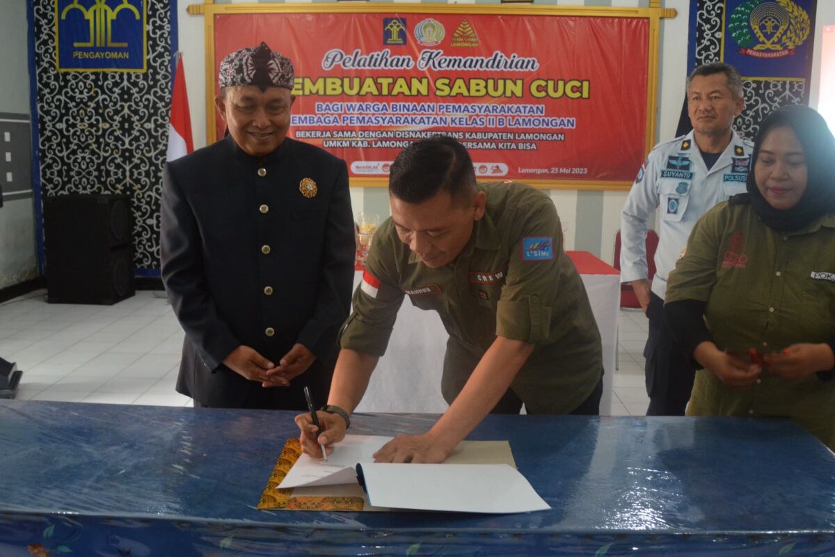 Berikan Pelatihan Kemandirian Pembuatan Sabun Cuci Bagi WBP, Lapas Lamongan Lakukan MoU Dengan Disnakertrans Kabupaten Lamongan.