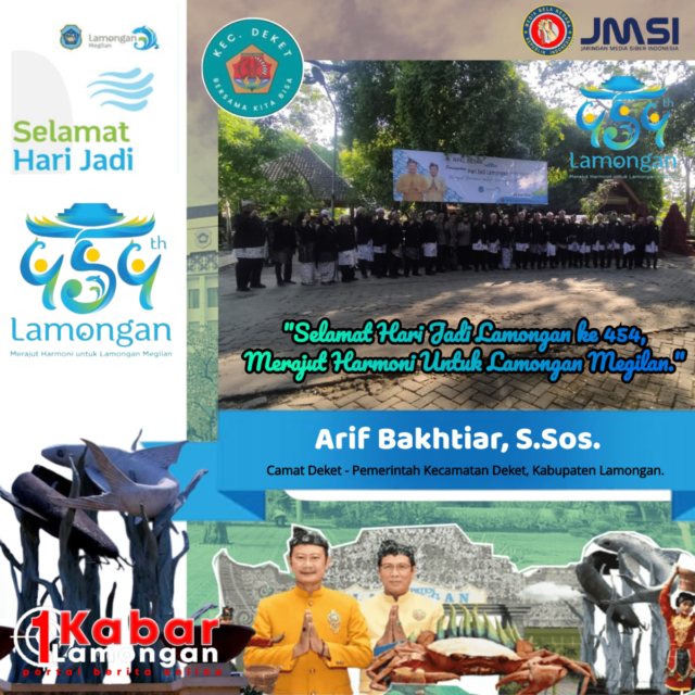 Kabar1lamongan.com – Atas Nama Pemerintah Kecamatan Deket, Kabupaten Lamongan. Dengan beribu ribu rasa syukur dan bangga turut mengucapkan, Selamat Hari Jadi Lamongan (HJL) yang ke 454 Tahun. Semoga Kabupaten Lamongan semakin baik dan makmur di segala bidang.