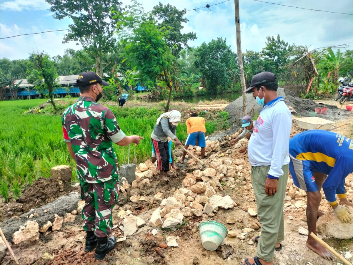 Kabar1lamongan.com – Babinsa Desa Karangsambigalih Koramil 0812/13 Sugio, Serka Suwadi bersama warga gotong royong bangun Tembok penahan tanah jalan area persawahan di Dusun Galih Desa Karangsambigalih Kecamatan Sugio, Minggu (16/07/2023).