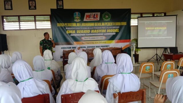 Kabar1lamongan.com -Masa Pengenalan Lingkungan Sekolah (MPLS) bagi siswa -siswi baru di SMA Wahid Hasyim Model, Desa Sumberwudi Kecamatan Karanggeneng diisi dengan pembekalan materi Wawasan kebangsaan dan bela negara yang dilakukan Danramil 0812/15 Karanggeneng Kapten Inf Bambang, Rabu (19/07/2023).