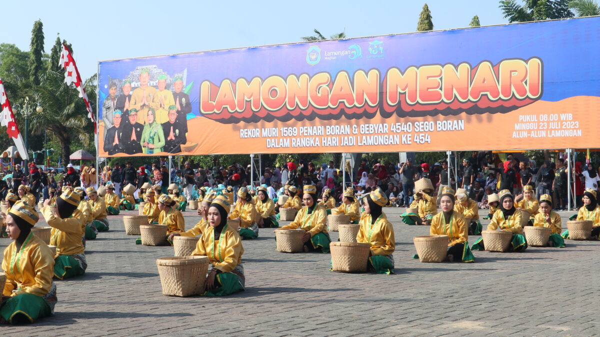 Kabar1lamongan.com – Mengangkat kearifan lokal Lamongan dalam rangka Peringatan Hari Jadi Lamongan ke 454 tahun, dengan menyuguhkan Pagelaran Kolosal Tari Boranan yang diikuti 1.569 penari dari tingkat pelajar, juga melaksanakan Gebyar Sego Boran 4.540 porsi di Alun-alun Kota Lamongan pada Minggu (23/7/2023), Kabupaten Lamongan berhasil memecahkan Rekor Muri Dunia.