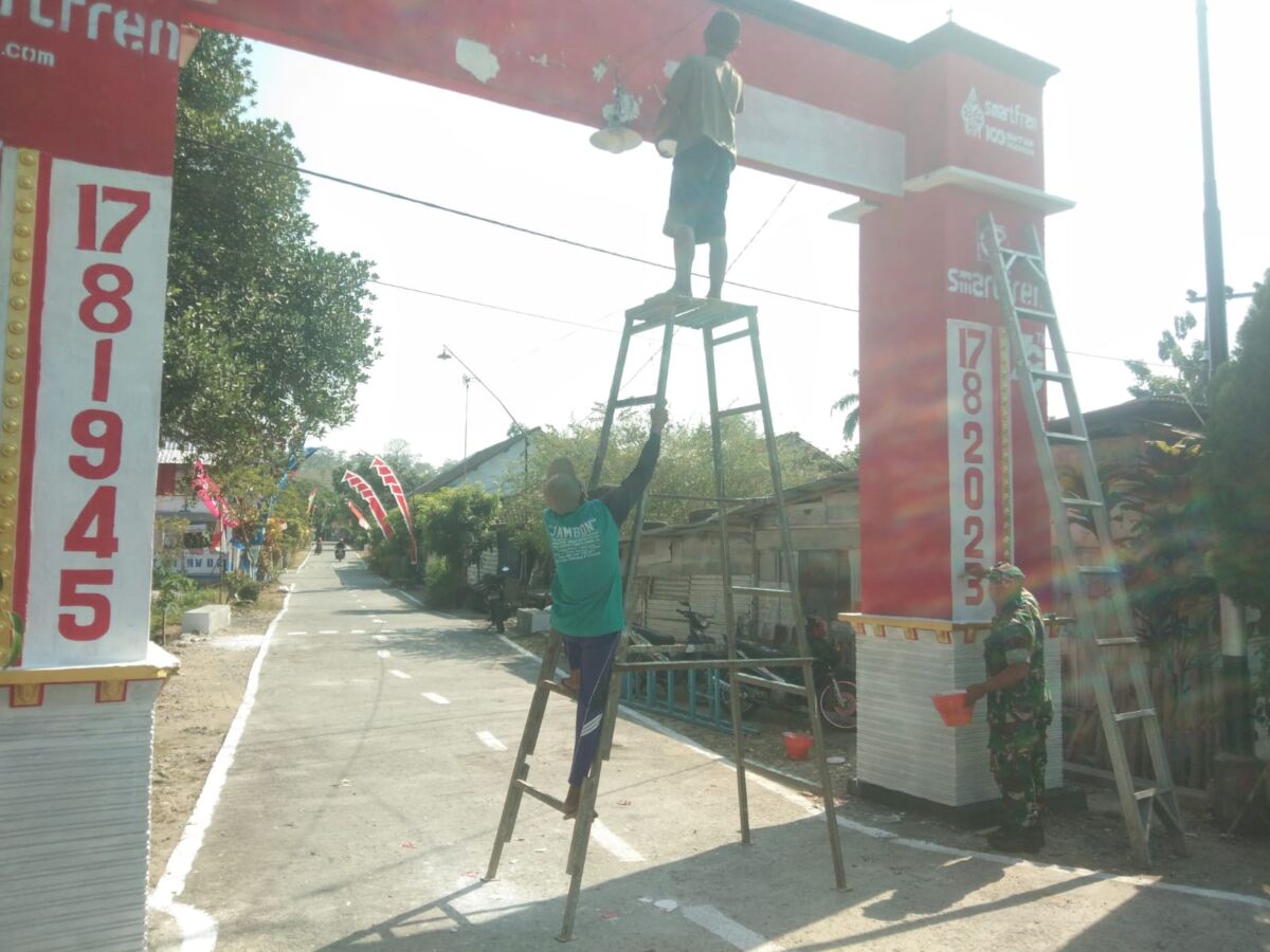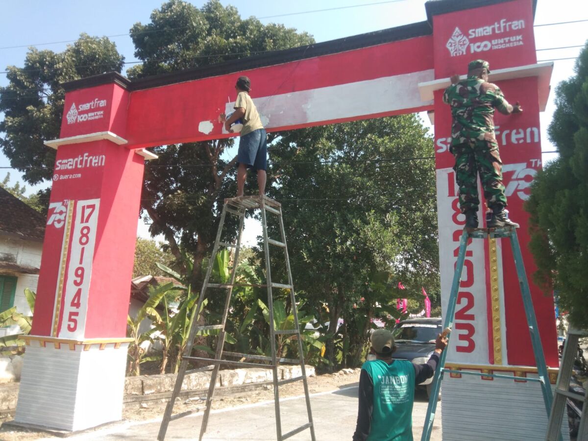 Berbagai upaya dilakukan, salah satunya mengecat gapura nuansa merah putih dan memasang bendera merah putih serta berbagai hiasan lainnya, Selasa (15/08/2023)