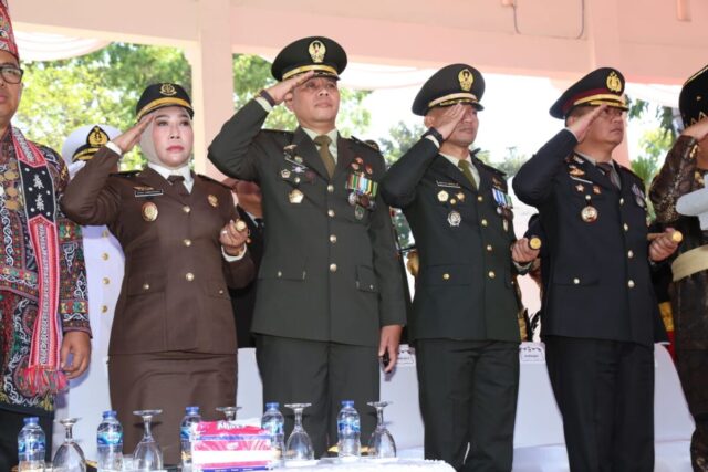 Sebelumnya, bendera merah putih diserahkan Bupati Lamongan Dr. H Yuhronur Efendi, MBA kepada pembawa baki, Ratih Ratnasari dari SMADA yang kemudian diberikan kepada Ega Abhista Candra dari SMAN I Ngimbang Lamongan untuk dikibarkan.