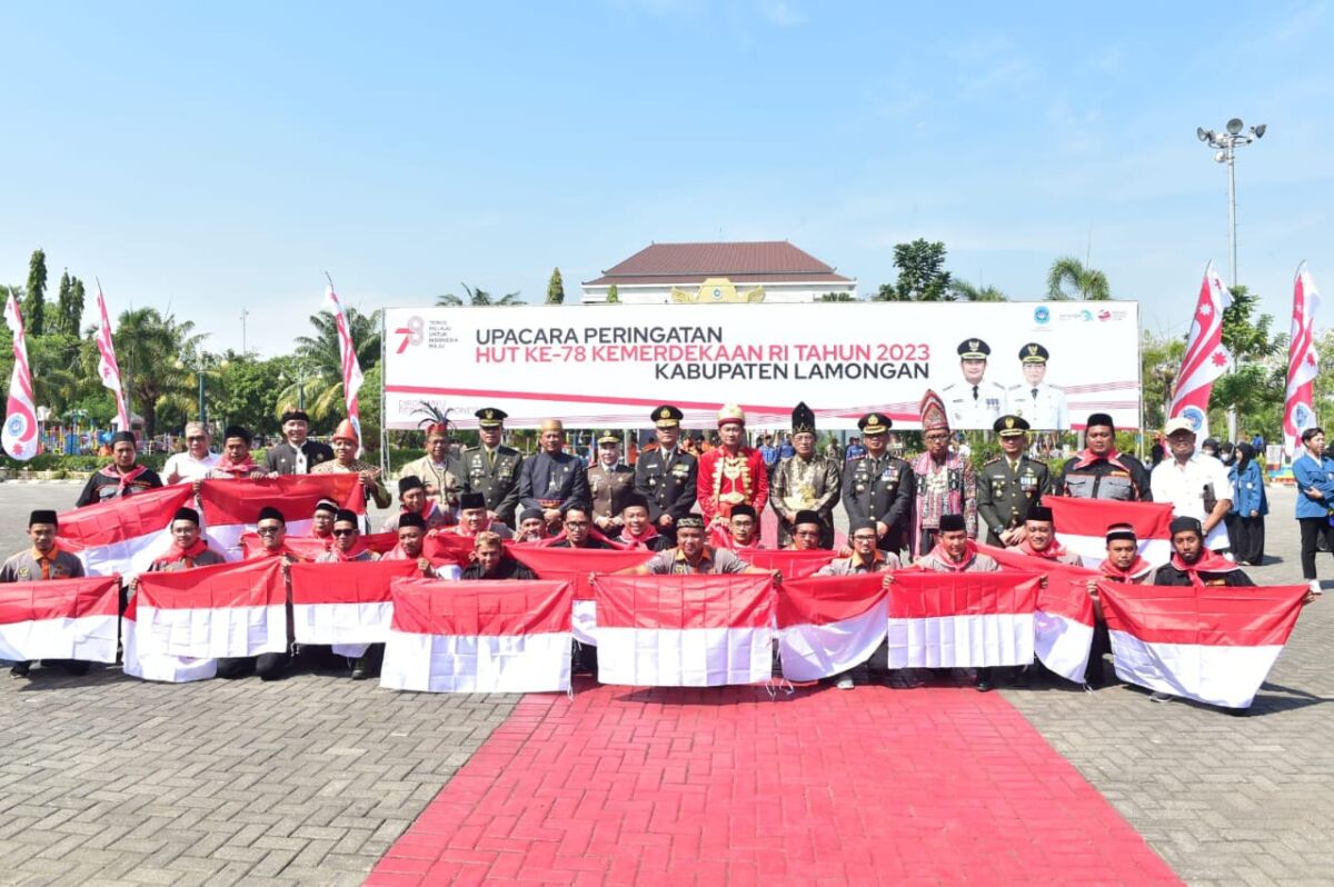 Proses sakral Pengibaran Bendera Merah Putih sebagai penanda Peringatan Kemerdekaan dimulai dengan penyerahan bendera dari Bupati Yuhronur Efendi kepada petugas pembawa baki Rati Ratnasari perwakilan SMAN 2 Lamongan, untuk kemudian diserahkan kepada pasukan pengibar bendera dan selanjutnya dikibarkan. Bertugas sebagai pembawa bendera Ega Abhista Candra Adyatama dari SMAN 1 Ngimbang, pembentang bendera Muhammad Waul Iman Danis dari MA Mazro’atul Ulum Paciran, dan pengerek bendera Diyo Micky Dwi Nur Effendi dari SMKN 1 Sambeng.