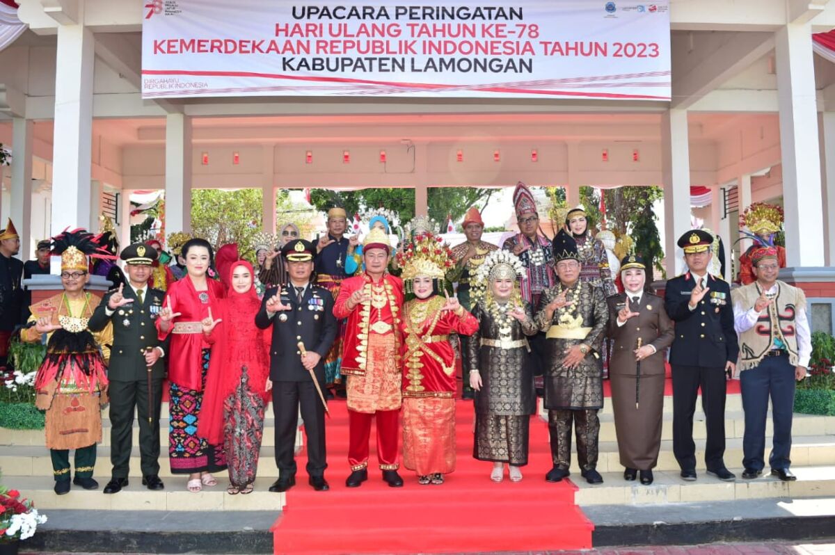 Bertindak sebagai Inspektur Upacara Bupati Lamongan Yuhronur Efendi pada kesempatan tersebut mengenakan Baju Adat Palembang Sumatera Selatan Aesan Paksangko, Wakil Bupati Lamongan Abdul Rouf mengenakan Baju Adat Riau, sedangkan Ketua DPRD Lamongan Abdul Ghofur yang bertindak sebagai Pembaca Teks Proklamasi Kemerdekaan mengenakan Baju Adat Bodo dari Makassar.