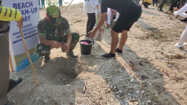 Kegiatan Beach Clean – Up Day (Cleanup, mangrove planting and sharing session) dimulai dengan Registrasi peserta dan pembagian masker dan sarung tangan kepada peserta kemudian dilanjutkan dengan penanaman Mangrove dan Cemara dilanjutkan pembersihan pantai oleh seluruh peserta Beach Clean – Up Day. (Pendim0812)
