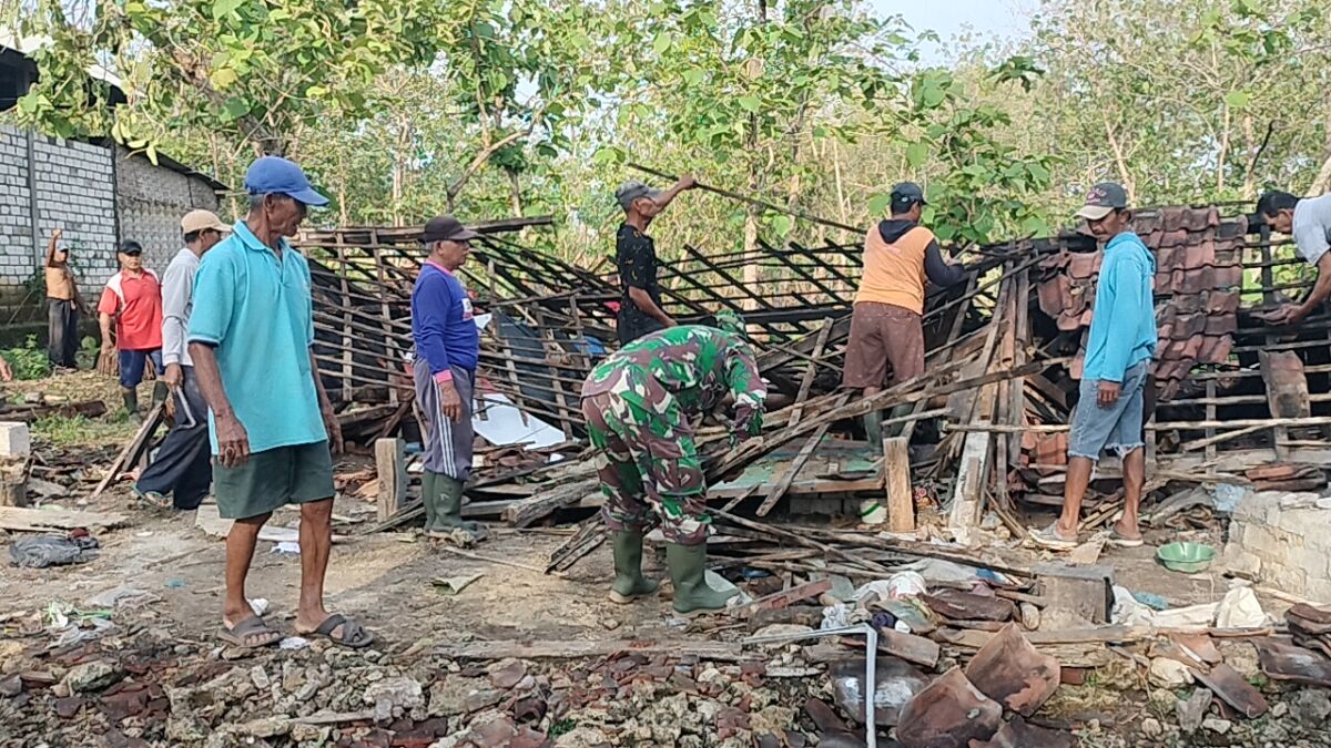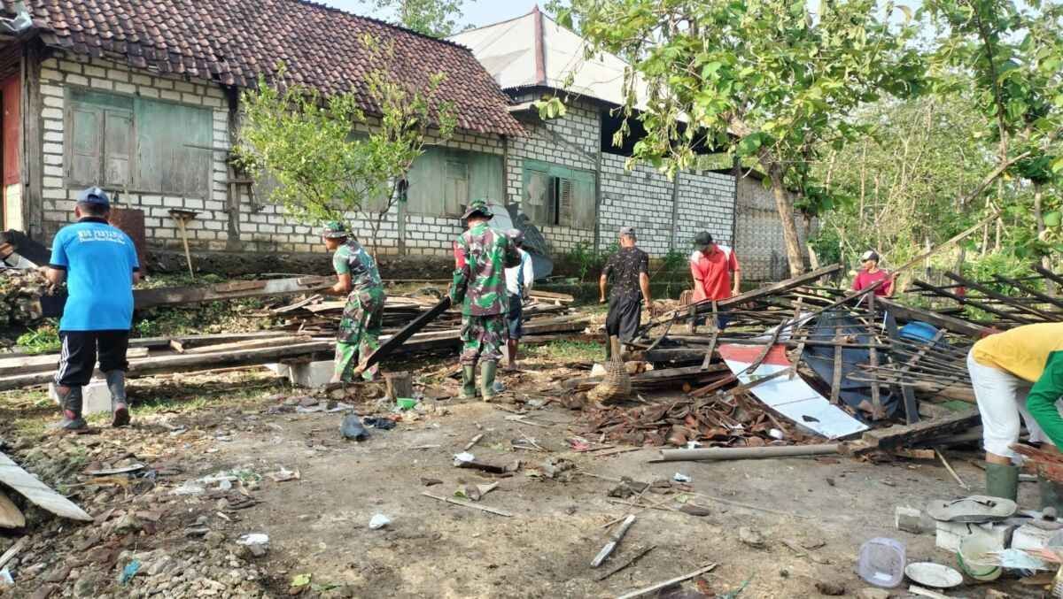 Sinergitas Koramil 0812/12 Modo Bersama Warga dan BPBD Gotong Royong Bersihkan Puing-puing Rumah Akibat Bencana. Foto