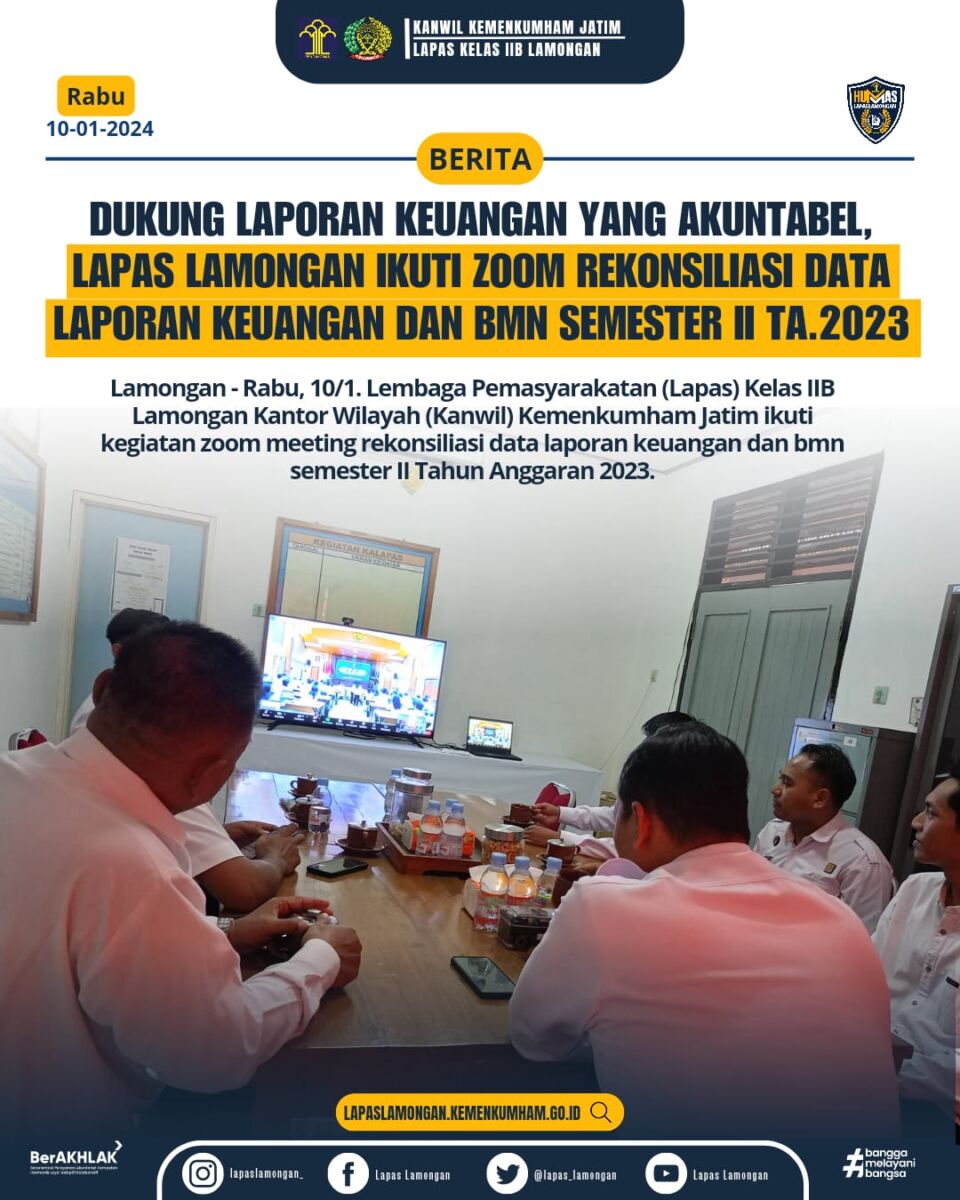 Kabar1lamongan.com – Rabu, 10/1. Lembaga Pemasyarakatan (Lapas) Kelas IIB Lamongan Kantor Wilayah (Kanwil) Kemenkumham Jatim ikuti kegiatan zoom meeting rekonsiliasi data laporan keuangan dan bmn semester II Tahun Anggaran 2023, kegiatan ini diikuti langsung oleh Kalapas Lamongan Mahrus beserta jajaran Tata Usaha.