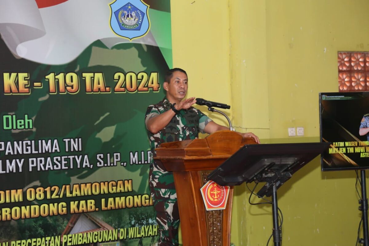 Tim Pengawas dan Evaluasi (Wasev) Mabes TNI Mayjen TNI Novi Helmy Prasetya S.I.P.,M.I.P di dampingi Danrem 082/CPYJ Kolonel Inf Heri Rustandi dan Dandim 0812/Lamongan Letkol Arm Ketut Wira Purbawan membagikan puluhan paket sembako kepada Lansia dan santunan anak yatim saat melaksanakan peninjauan di lokasi TMMD Reguler ke 119 Kodim 0812/Lamongan yang bertempat di Balaidesa Brengkok