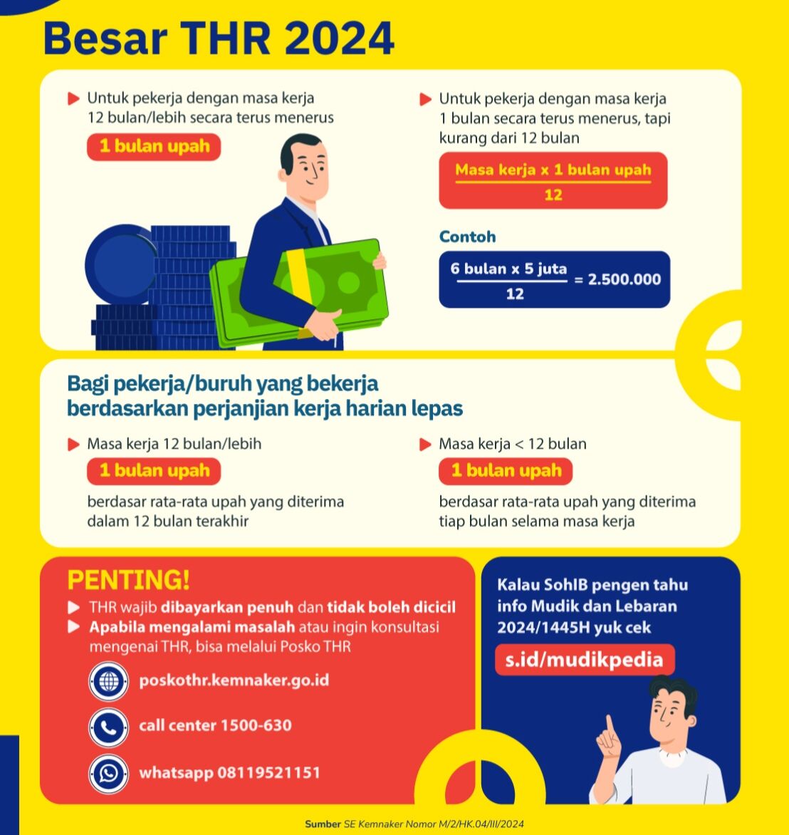Untuk kebijakan penetapan besaran THR dan berapa minimal besaran dana yang seharusnya diberikan, Untuk karyawan/buruh pabrik setelah 1 tahun kerja adalah diberikan 1 bulan gaji upah, bagi pekerja sebelum 1 tahun kerja adalah masa kerja bulan di bagi 12 dikalikan upah pokok dan jika masa kerja lebih dari 1 tahun yang sudah ada nilainya tidak boleh di kurangi, lanjut Ketua Kahutindo Kabupaten Lamongan itu.