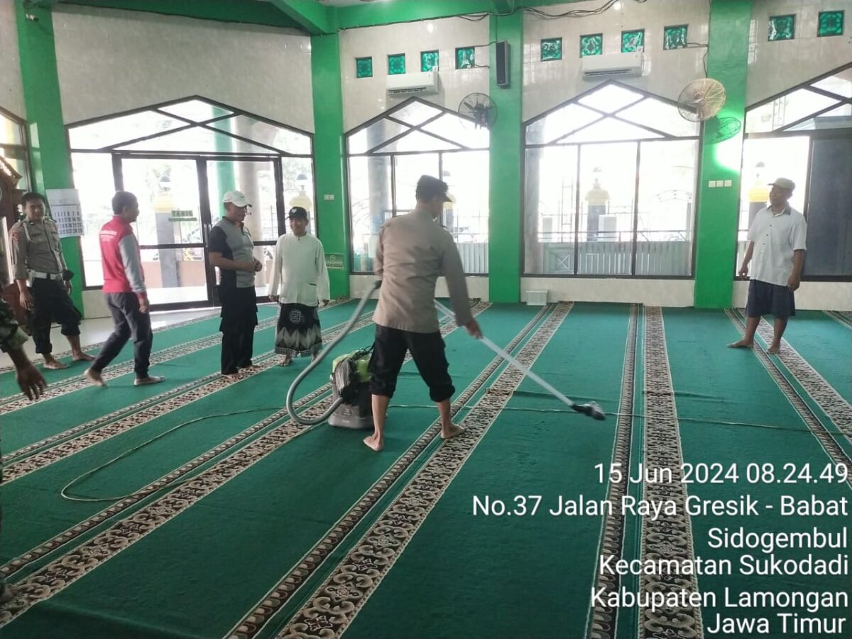Kapolsek Sukodadi bersama anggotanya dengan semangat membersihkan area sekitar masjid, termasuk halaman, ruang sholat, dan fasilitas lainnya.