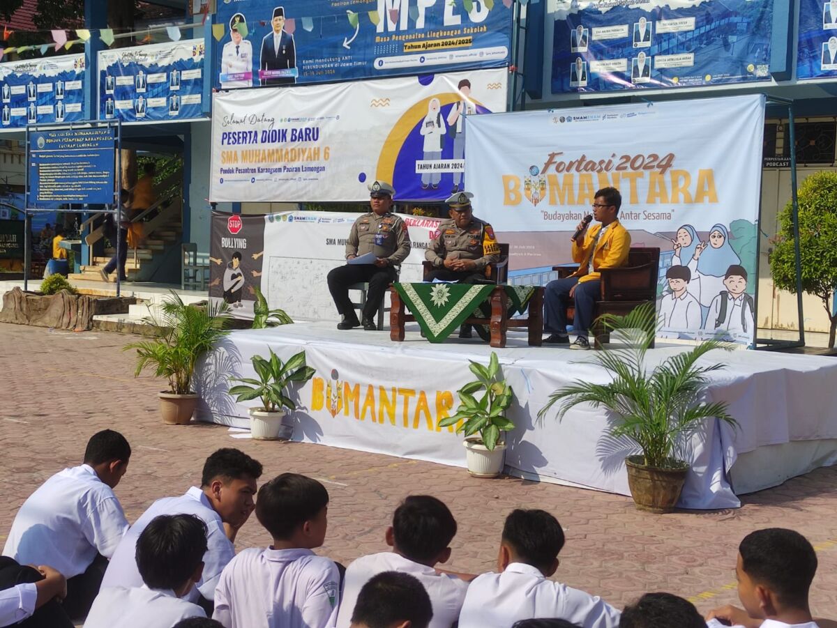 Lamongan, Kabar1lamongan.com, 19/07/2024 – Dalam rangka Masa Pengenalan Lingkungan Sekolah (MPLS) dan kegiatan Fortasi bagi siswa, Satlantas Polres Lamongan melaksanakan sosialisasi Ops Patuh Semeru 2024 di halaman SMAM 6 Pondok Pesantren Karangasem Muhammadiyah Paciran, Lamongan.
